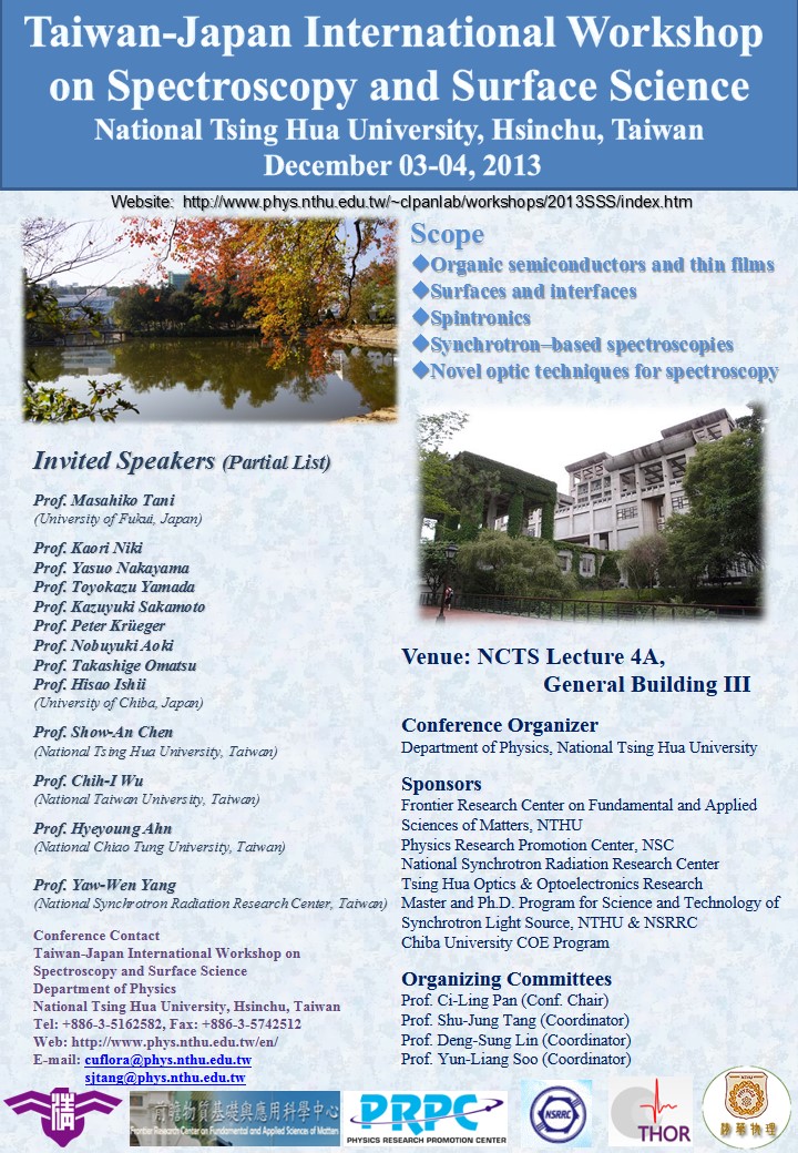 The organizing committee cordially invites all of you who are interested in this general field to participate and enjoy the excitement and fun of the 2013 Taiwan-Japan International Workshop on Spectroscopy and Surface Science in Hsinchu.