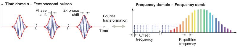 The upper diagram is pulses from mode-locked lasers in time domain. The lower diagram is the pulses in frequency domain. The spectral coverage and cavity modes are represented by colorful and broken blue lines respectively. The offset frequency δ is caused by the relative phase φ between envelope and carrier.