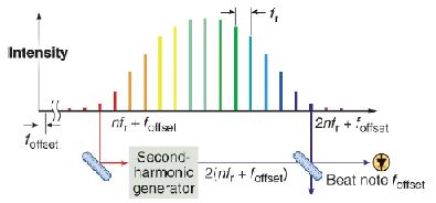 The f-2f self-referencing scheme for measuring the offset frequency. Kerr-lens mode-locking allows the generation of light pulses whose durations are as short as a few femtoseconds. Our laser is a Kerr-lens mode-locked Ti:sapphire laser (Gigaoptics, Gigajet20). The repetition frequency is about 1 GHz and the pulse width is about 35 fs. The output spectrum is centered at 810 nm with a bandwidth of 40 nm. The output power is larger than 650 mW under 5 W 532 nm pumping. The major output beam is coupled into a 1 m long photonic crystal fiber (PCF, Crystal Fibre A/S, NL-PM-750). This PCF is recommended by the manufacturer for supercontinuum generation excited by mode-locked Ti:sapphire laser. |