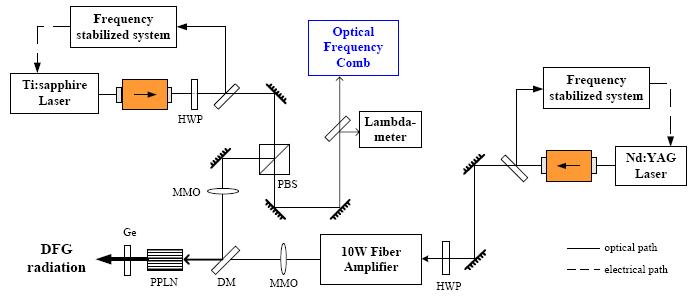 | Experimental Apparatus Mid-infrared laser sources come in many different varieties shown in Fig. For their application to spectroscopic measurement, and specifically for quantitative measurements, the ideal source would have the following properties: (1) sufficient optical power to overcome inherent electronic detection noise and ensure high laser signal-tonoise ratios, (2) narrow linewidth to obtain high selectivity and sensitivity, (3) single longitudinal mode operation. A number of IR DFG sources have been constructed and used for spectroscopy. In the case of our DFG laser shown in Fig. 3.2, Ti:sapphire (“pump”) and Nd:YAG (“signal”) laser at different frequencies combined in a nonlinear material with suitable dispersion characteristics generate a beam at the difference-frequency (“idler”). The narrow emission spectra of the “pump” (highest frequency) and “signal” (middle frequency) translate into a similarly narrow spectrum of the idler wave. In general, idler wavelength tuning is accomplished by tuning the pump laser, or signal laser, or both. In order to building up the idler wave continually while the beams pass collinearly through the nonlinear material, the three waves must stay in proper phase.