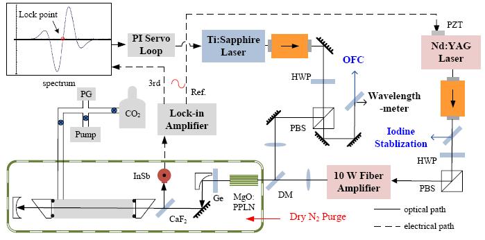 | Frequency Stabilizatio Schematic diagram of frequency locking of a Nd:YAG laser to the Dopplerfree transition of iodine. Visible radiation(532 nm) is produced by double-frequency generation in a MgO:PPLN crystal. The produced green light is retroreflected through the iodine cell to observe the Doppler-free spectrum: OI = optical isolator; HWP = half-wave plate; MgO:PPLN = periodically poled MgO doped lithium niobate crystal; DBS = dichroic beamsplitter; PBS = polarizing beamsplitter; QWP = quarter-wave plate; PR = partial reflector; PD = photodetector. |