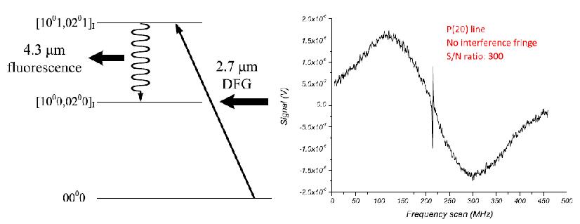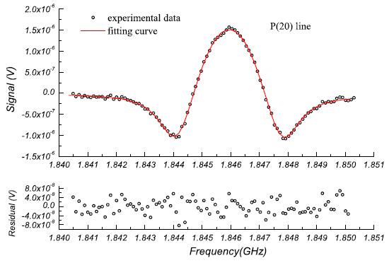 | Experimental Results P(20) Doppler profile using directly pump-prob saturation spectroscopy @ 2.7 μm The first-derivative Lamb-dip spectrum of [1001,0201]I 0000 band of P(20) line for the following experimental condition: Pressure P = 20 mTorr, modulation amplitude Am = 1.5 MHz, modulation frequency m = 400 Hz, lock-in time constant lock-in = 300 ms, frequency span span = 500 MHz, scan time Tscan = 500 s. The second-derivative Lamb-dip spectrum of [1001,0201]I 0000 band of P(20) line for the following experimental condition: Pressure P = 20 mTorr, modulation amplitude Am = 1.9 MHz, modulation frequency m = 400 Hz, lock-in time constant lock-in = 300 ms, frequency span span = 10 MHz, scan time Tscan = 500 s |